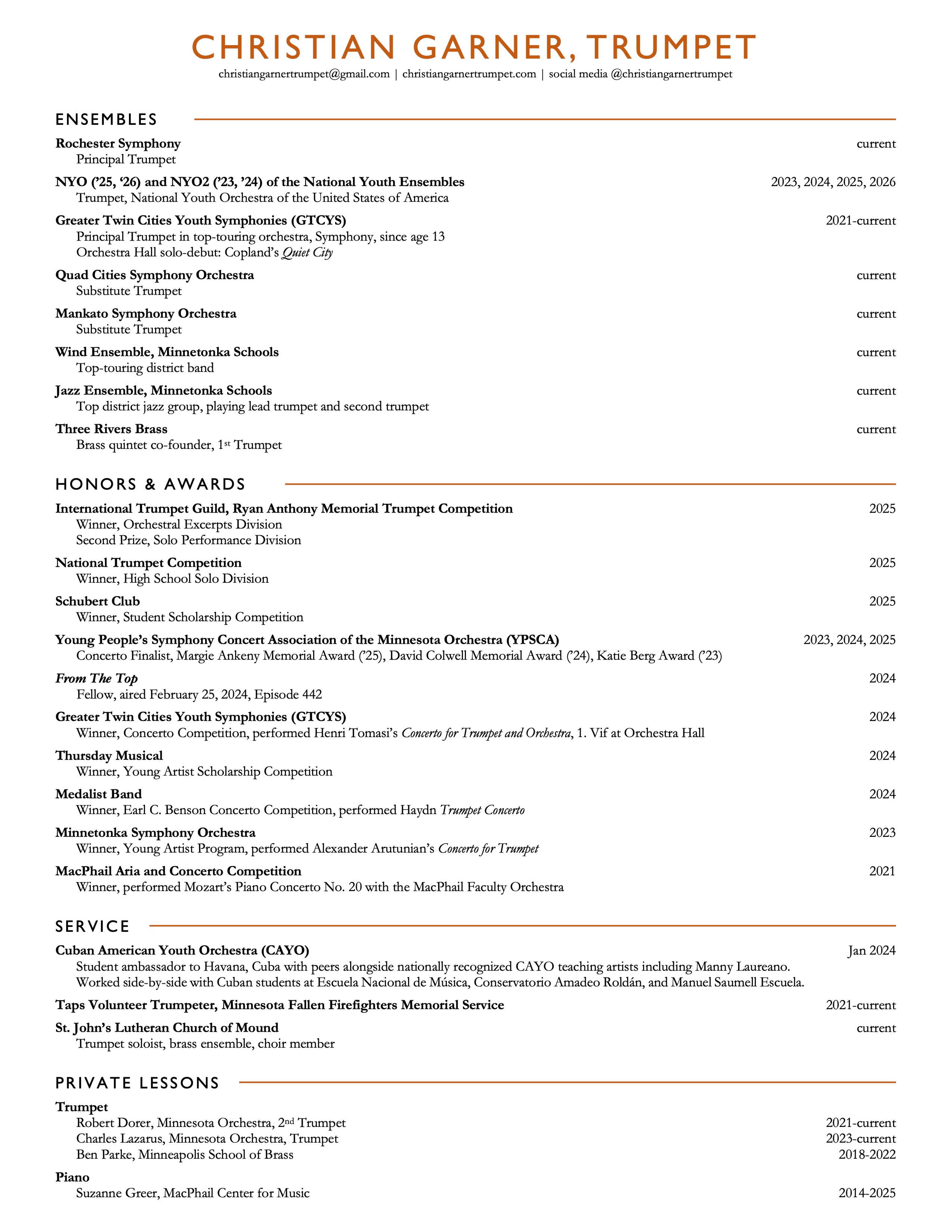 Christian Garner is the principal trumpet of the Rochester Symphony and a junior at Minnetonka High School; he primarily studies with Robert Dorer and Charles Lazarus of the Minnesota Orchestra. Last summer, Christian toured Japan, Hong Kong, China, and South Korea with Carnegie Hall’s premier national youth ensemble, NYO-USA, and will join them again this summer to perform Bartok’s Concerto for Orchestra at renowned European venues such as The Concertgebouw in Amsterdam and Usher Hall in Edinburgh.Since thirteen, Christian has been principal trumpet in the Greater Twin Cities Youth Symphonies (GTCYS) top touring ensemble, Symphony, touring France and Spain, playing Copland’s Billy the Kid, Mahler’s Blumine, and Stravinsky’s Firebird Suite at the Palau de la Música Catalana, as well as in Italy, performing Shostakovich’s Symphony No. 5 at the ancient Greek amphitheater in Taormina. This summer, he will travel with GTCYS to Australia and New Zealand, soloing on John Williams’ “With Malice Towards None” (from Lincoln) and playing with the brass section on Prokofiev’s Romeo and Juliet at the Sydney Opera House. A career highlight was playing Tomasi’s Concerto for Trumpet and Orchestra with GTCYS at Orchestra Hall, Minneapolis.In 2025, Christian won the National Trumpet Competition and orchestral excerpts division of the International Trumpet Guild’s Ryan Anthony Memorial Trumpet Competition. You can hear him play Kennan’s Sonata for Trumpet and the famous piccolo trumpet fanfare, Ablassen, on From the Top. Other solo performances include Arutunian’s Trumpet Concerto with the Minnetonka Symphony and Haydn’s Trumpet Concerto with Medalist Band. Local honors include first prizes from Thursday Musical and Schubert Club and being a finalist in the Minnesota Orchestra’s YPSCA Concerto Competition.An accomplished pianist, Christian studied piano with Suzanne Greer and won the MacPhail Concerto Competition. Outside of music, he enjoys playing with his dogs, mountain biking, and skiing.
